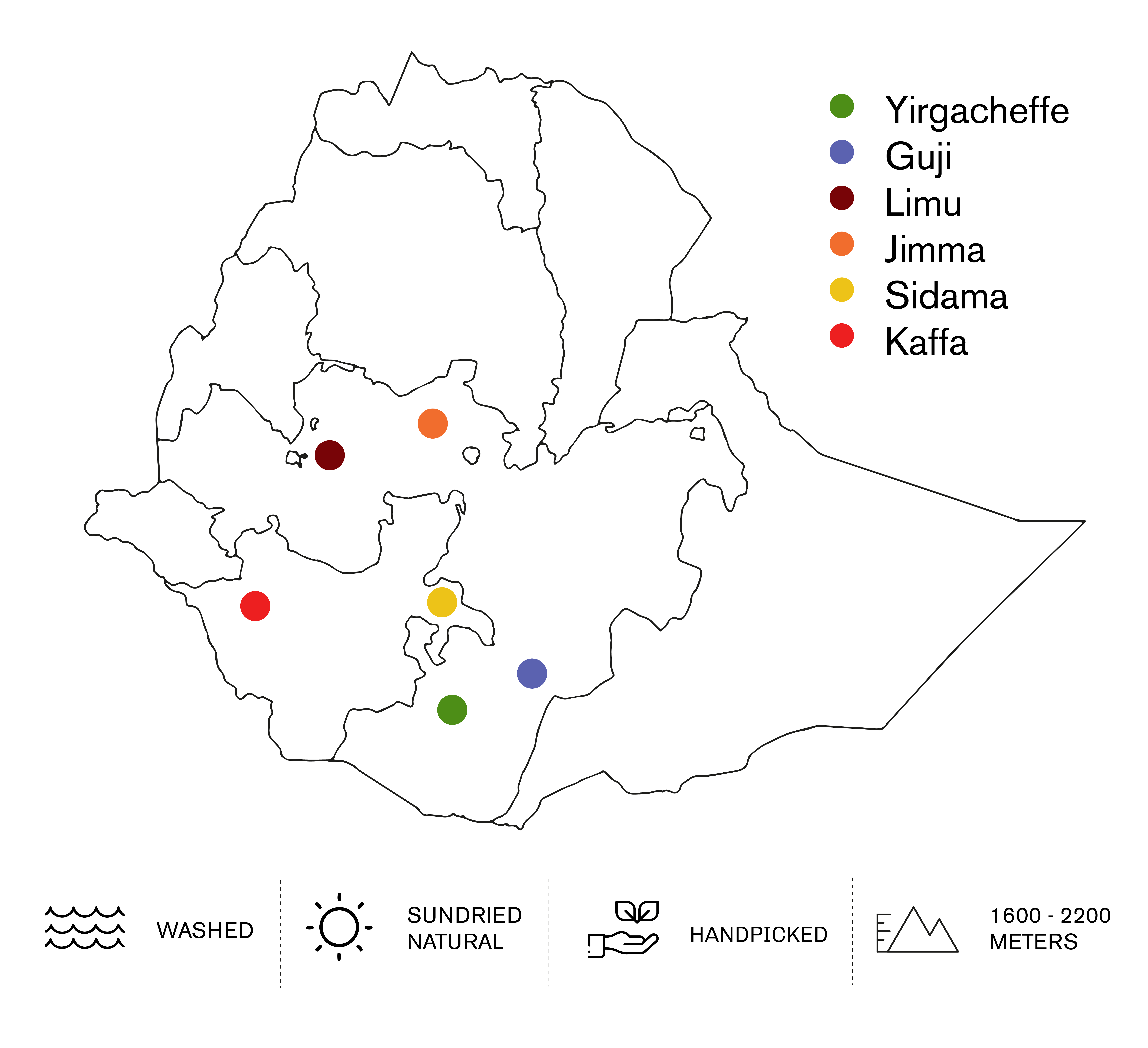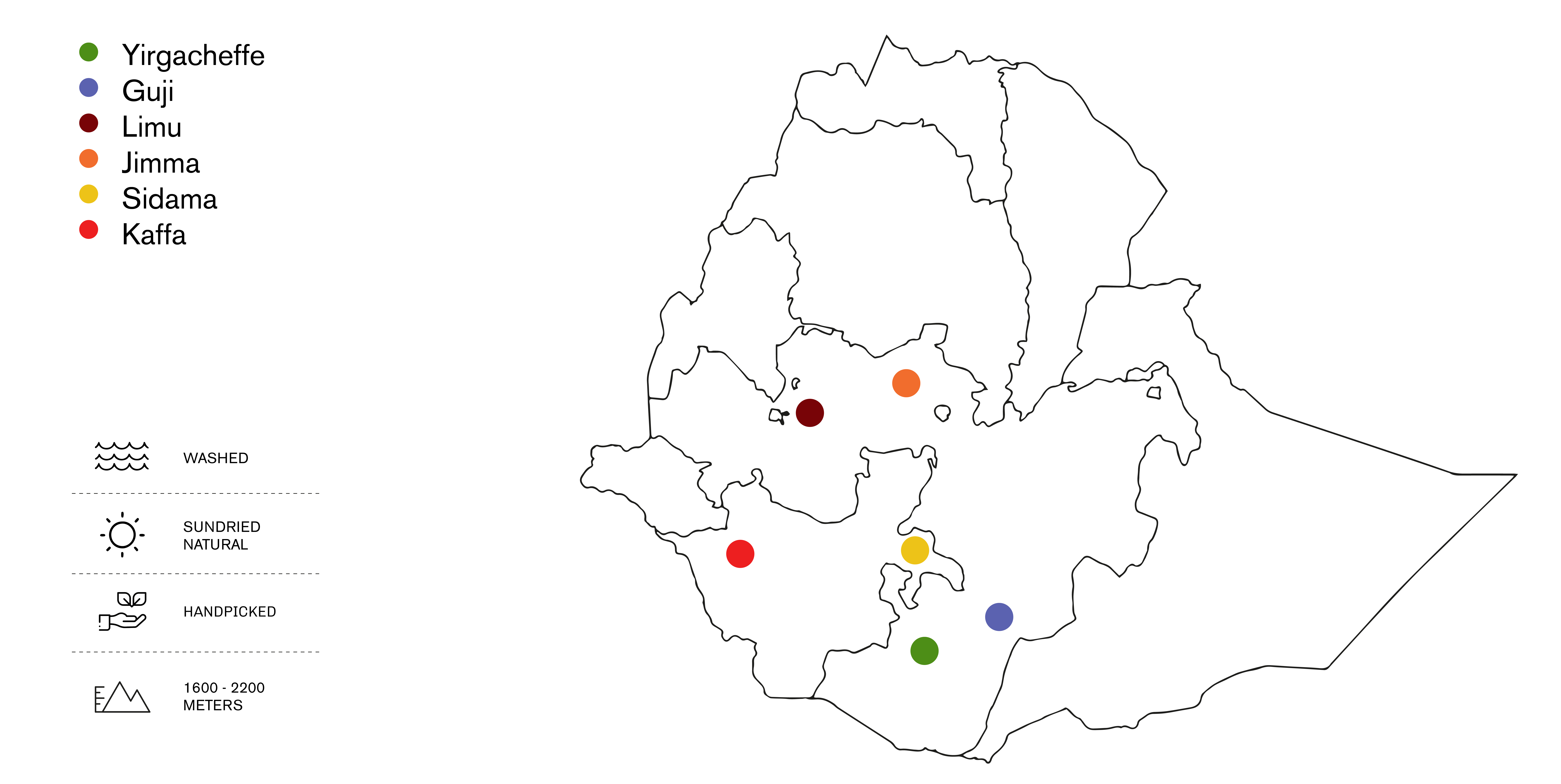 Alle vores kaffebønner kommer fra Etiopien, kaffens fødested. Vi samarbejder med over 800 småskalabønder for at bringe dig den bedst mulige kaffe. Dyrket i en højde af 1.600-2.200 meter i de etiopiske højlande, vokser vores Arabica træer under ideelle forhold, hvor kaffebærrene nænsomt håndplukkes fra familiegårde. Disse højlandsforhold giver bønnerne en bred vifte af smagsprofiler- fra lyse og blomstrede til frugtige, søde, nøddeagtige og chokoladeagtige nuancer.
